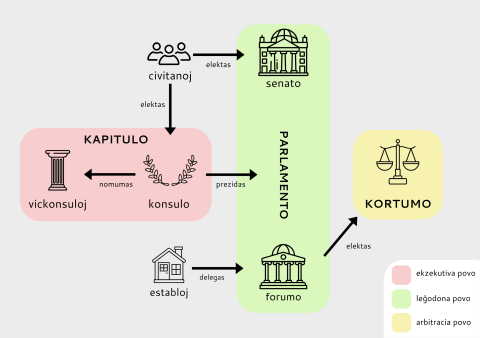 Ili povas referenci al la plenumo de la konstituciaj povoj: tie primaraj instancoj estas la Kapitulo, la Parlamento, la Kortumo, kaj sekundaraj la Registro, la Civita Banko, la legacioj, la Lingva Komitato.